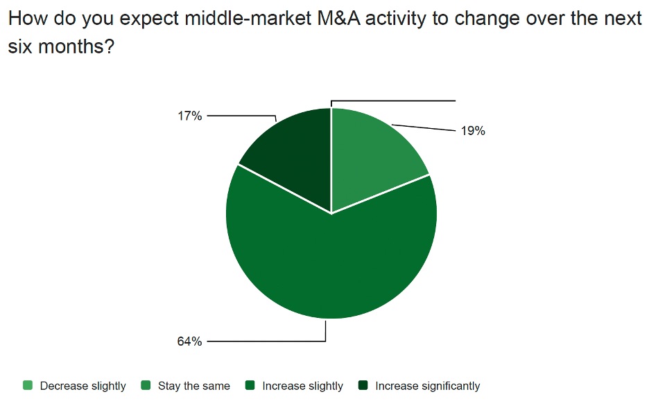 That modest confidence extends to the debt markets, with the same portion of survey respondents (64%) describing a somewhat favorable financing environment for middle-market dealmakers today. None described the current environment as either “very favorable” or “very unfavorable.”