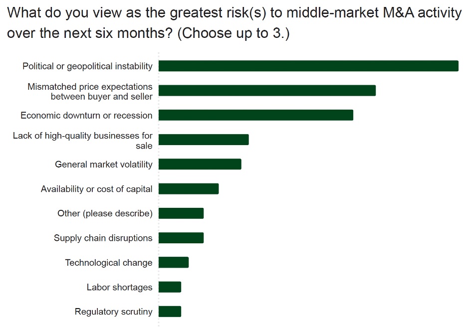 Still, political and geopolitical instability weigh heavy on dealmakers’ minds, and indeed emerged as the largest risk to middle-market M&A survey respondents identified in the next six months. That was followed by the narrow—but persistent—valuation gap, with the risk of an economic downturn or recession coming in third.
