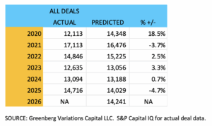 The huge miss in the pandemic year of 2020 is no surprise. After that, the model has turned in five solid years. The largest recent deviation is in 2025, where it looks like the predicted count will fall short of actual by 4.7%. (S&P Capital IQ’s data for 2025 is the total through November annualized.)