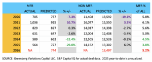 When we pull manufacturing apart from the rest of the data set, we see remarkable flux in the deep-COVID years of 2020-2021, but then an even more dramatic departure from convention in 2024 through 2025.