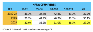From 2020-2023, the manufacturing business category accounted for 37% of the GF Data pool—in line with historic averages. This more focused data set shows a more modest decline in 2024 deal volume than in the S&P Capital IQ numbers. But, as with Cap IQ, GF Data’s manufacturing deal share drops dramatically in 2025 to date: